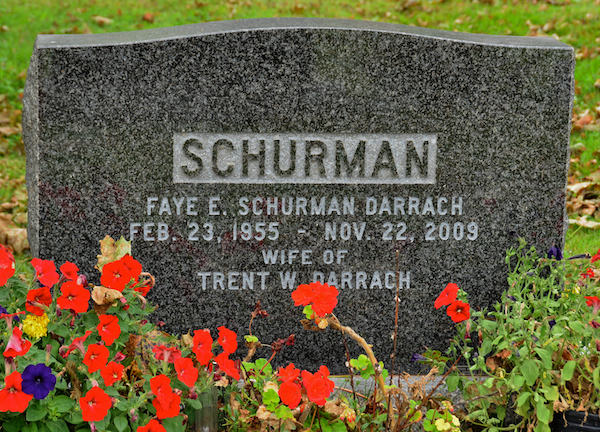 | Burial | She was buried in the Peoples Cemetery, Summerside, Prince County, Prince Edward Island, Canada, 46.40590, -63.77535G. Inscription: SCHURMAN / Donald M. Schurman / Apr. 28, 1912 - Jan. 15, 2006 / His Wife / Martha V. Dawson /1925-2010 / Your love will light the way Back: SCHURMAN / Faye E. Schurman Darrach / Feb. 23, 1955 - Nov. 22, 2009 / Wife of / Trent W. Darrach.1,2 Tombstone, Donald Montgomery Schurman (1912-2006), his wife Martha Violet Dawson (1925 -2010), their daughter Faye Edith Schurman (1955-2009). Peoples Cemetery, Summerside, Prince County, Prince Edward Island, Canada.  Back inscription detail. |
