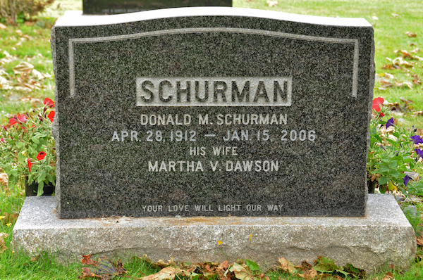 | Burial | He was buried in the Peoples Cemetery, Summerside, Prince County, Prince Edward Island, Canada, 46.40590, -63.77535G. Inscription: SCHURMAN / Donald M. Schurman / Apr. 28, 1912 - Jan. 15, 2006 / His Wife / Martha V. Dawson / / Your love will light the way Back: SCHURMAN / Faye E. Schurman Darrach / Feb. 23, 1955 - Nov. 22, 2009 / Wife of / Trent W. Darrach.4 Tombstone, Donald Montgomery Schurman (1912-2006), his wife Martha Violet Dawson (1925-2010), their daughter Faye Edith Schurman (1955-2009). Peoples Cemetery, Summerside, Prince County, Prince Edward Island, Canada.  Back inscription detail. |