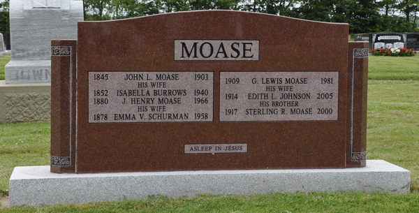 | Burial | He was buried in the Peoples Cemetery, Kensington, Prince County, Prince Edward Island, Canada, 46.44763, -63.62899G. Section J, Row 4, Stone #150.Inscription: MOASE / 1845 John L. Moase 1903 / His Wife / 1852 Isabella Burrows 1940 / 1880 J. Henry Moase 1966 / His Wife / 1878 Emma V. Schurman 1958 | 1909 G. Lewis Moase 1981 / His Wife / 1914 Edith L. Johnson 2005 / His Brother / 1917 Sterling R. Moase 2000 // Asleep in Jesus. Back: MOASE.3,1 Tombstone, Peoples Cemetery, Kensington, Prince County, Prince Edward Island, Canada. John Lewis Moase (1845-1903), his wife Isabella Burrows (1852-1940), their son Henry Moase (1880-1966), his wife Emma Schurman (1878-1958), their son Lewis Moase (1909-1981), his wife Edith Johnson (1914-2005), Sterling Moase (1917-2000), brother of Lewis. |