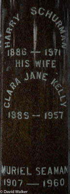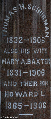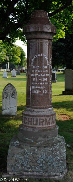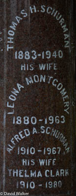 Section I-5, Row 6, Stone 748. Cylindrical polished red granite obelisk. Inscription, Front: Thomas H. Schurman / 1832 - 1906 / Also His Wife / Mary A. Baxter / 1831 - 1906 / And Their Son / Howard L. / 1865 - 1906 / SCHURMANLeft: George D. Schurman / Died / June 1, 1913 / AEt 60 / His Wife / Mary J. Silliker / Died / May 19, 1944 / AEt 94 / Eldon D. Schurman / 1917 - 1982 Right: Thomas H. Schurman / 1883 - 1940 / His Wife / Leona Montgomery / 1880 - 1963 / Alfred A. Schurman / 1910 - 1967 / His Wife / Thelma Clark / 1910 - 1980 Back: Harry Schurman / 1886 - 1971 / Clara Jane Kelly / 1889 - 1957 / Muriel Seaman / 1907 - 1960.2,3  Tombstone, Thomas Hooper Schurman (1832-1906), his wife Mary Ann Baxter (1831-1906), their sons Howard Lincoln Schurman (1865-1906) and George Darby Schurman (1852-1913), his wife Mary Jane Silliker (1850-1944), their son Harry James Schurman (1886-1971), his wife Clara Jane Kelly (1889-1957), their other son Thomas Hooper Schurman (1883-1940), his wife Leona Montgomery (1880-1963), their sons Eldon Davis Schurman (1917-1982) and Alfred Alphonso (1910-1967), his wife Thelma Ruth Clark (1910-1980), and Muriel Seaman (1907-1960), whose identity is unkown at this writing. Peoples Cemetery, Summerside, Prince County, Prince Edward Island, Canada.  Front inscription.  Left inscription.  Right inscription.  Back inscription.