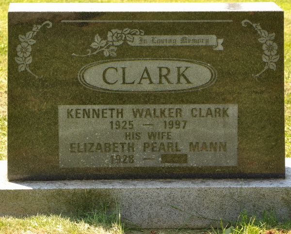 Rectangular black marble stone.Inscription: In Loving Memory / Clark / Kenneth Walker Clark / 1925 - 1997 / His Wife / Elizabeth Pearl Mann / 1928 - 2020Back: CLARK.1  Tombstone, Kenneth Walker Clark (1925-1997) and Elizabeth Pearl Mann (1928- ), the Peoples Cemetery, Kensington, Prince County, Prince Edward Island, Canada.