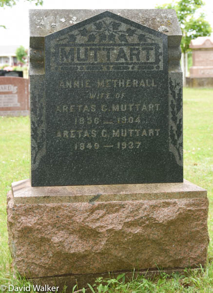 Inscription: MUTTART / Annie Metherall / Wife of / Aretas C. Muttart / 1856 - 1904 / Aretas C. Muttart / 1849 - 1937.3,2  Tombstone, Aretas Muttart (1849-1937), his wife Annie Metherall (1856-1904). United/Methodist Cemetery, Cascumpec, Prince County, Prince Edward Island, Canada.