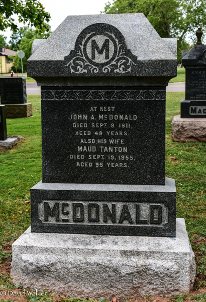 Inscription: At Rest / John A. McDonald / Died Sept. 9, 1911 / Aged 48 Years / Also His Wife / Maud Tanton / Died Sept. 19, 1955 / Aged 95 Years / McDONALD.2,9  Tombstone, John A. McDonald (c1863-1911), his wife Maud Tanton (c1860-1955). Peoples Cemetery, Summerside, Prince County, Prince Edward Island, Canada.