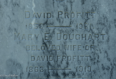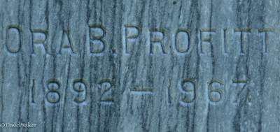 Inscription: David Profitt / 1858 - 1931. / Mary E. Doughart / Beloved Wife of / David Profitt / 1863 - 1919 / PROFITTRight: Ora B. Profitt / 1892 - 1967.1  Tombstone, David Profitt (1858-1931), his wife Mary Emily Doughart (1863-1919), their daughter Ora B. Profitt (1892-1967). The Peoples Cemetery, Kensington, Prince County, Prince Edward Island, Canada.  Front inscription detail.  Right inscription detail.