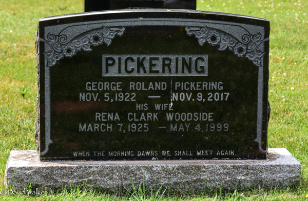 Inscription: PICKERING / George Roland Pickering / Nov. 5, 1922 - Nov. 9, 2017 / His Wife / Rena Clark Woodside / March 7, 1925 - May 4, 1999 / When the morning dawns we shall meet again.1,3  Tombstone, George Roland Pickering (1922-2017), his wife Rena Clark Woodside (1925-1999). United Church Cemetery, Margate, Prince County, Prince Edward Island, Canada.