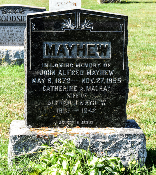 Inscription: MAYHEW / In Loving Memory of / John Alfred Mayhew / May 9, 1872 - Nov. 27, 1955 / Catherine A. MacKay / Wife of Alfred J. Mayhew / 1867 - 1942 /Asleep in Jesus.3,5  Cemetery Marker: John Alfred Mayhew (1871-1955), his wife Catherine A. MacKay (1867-1942). United Church Cemetery, Margate, Prince County, Prince Edward Island, Canada.