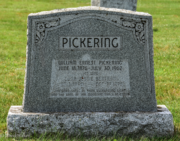 Inscription: PICKERING / William Ernest Pickering / June 18, 1876 - July 30, 1962 / His Wife / Edna Jessie Bertram / Jan. 3, 1890 - Dec. 27, 1978 / The Lord shall be thine everlasting light / And the days of thy mourning shall be ended.1,3  Tombstone, William Ernest Pickering (1876-1962), his wife Edna Jessie Bertram (1890-1978). United Church Cemetery, Margate, Prince County, Prince Edward Island, Canada.