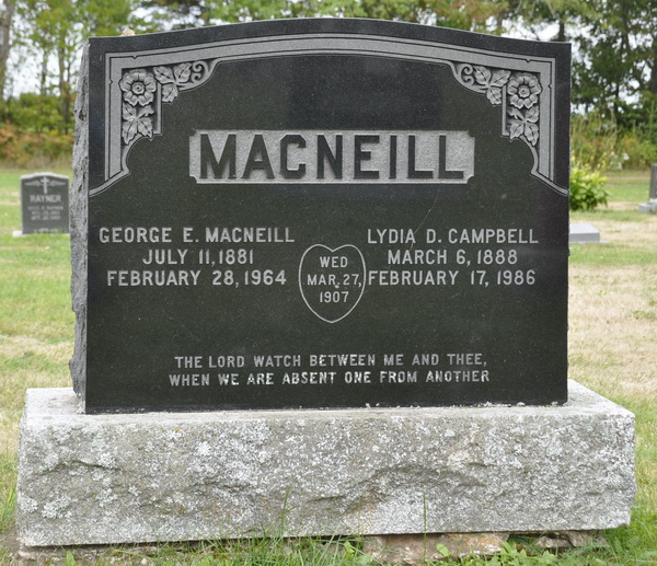 | Burial | He was buried in the Peoples Cemetery, Kensington, Prince County, Prince Edward Island, Canada, 46.44761, -63.62932G. Inscription: MACNEILL / George E. MacNeill / July 11, 1881 / February 28, 1964 | Wed Mar. 27, 1907 | Lydia D. Campbell / March 6, 1888 / February 17, 1986.1 Tombstone, George E. MacNeill (1881-1964), his wife Lydia D. Campbell (1888-1986). Peoples Cemetery, Kensington, Prince County, Prince Edward Island, Canada. |