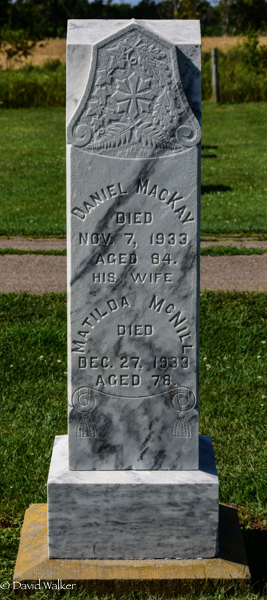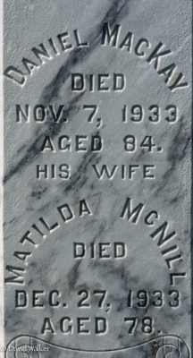 - [S13443] Cemetery marker, Geddie Memorial Cemetery, Springbrook, Queens County, Prince Edward Island, Canada. Daniel MacKay & Matilida MacNeill, tombstone inscription & photograph; documented by David A. Walker, 8 August 2018.