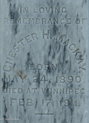 Inscription: Daniel MacKay / Died / Nov. 7, 1933 / Aged 84. / His Wife / Matilda McNill (sic) / Died / Dec. 27, 1933 / Aged 78Right: In Loving / Remembrance of / Chester H. MacKay / Born / May 24, 1890, / Died at Winnipeg / Feb. 17, 1911.3  Marker, Daniel MacKay 9c1849-1933), his wife Matilda MacNeill (1855-1933), their son Chester MacKay (1890-1911). Geddie Memorial Cemetery, Springbrook, Queens County, Prince Edward Island, Canada.  Front inscription detail.  Right inscription detail.