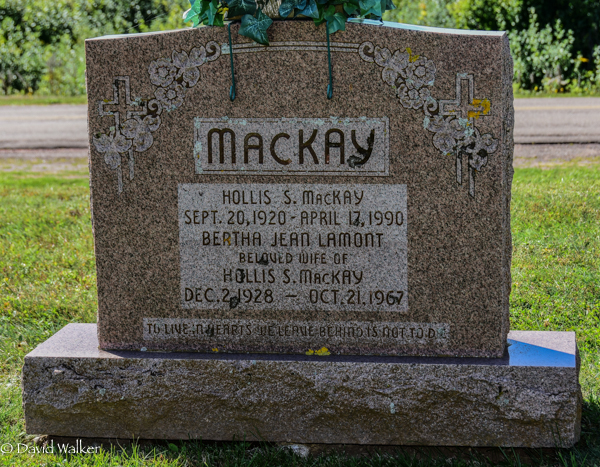 Inscription: MACKAY / Hollis S. MacKay / Sept. 20, 1920 - April 17, 1990 / Bertha Jean Lamont / Beloved Wife of / Hollis S. MacKay / Dec. 2, 1928 - Oct. 21, 1967.2,3  Cemetery Marker: Hollis Sturgeon MacKay (1920-1967), his wife Bertha Jean Lamont (1928-1967). St. Thomas Anglican Church Cemetery, Springbrook, Queens County, Prince Edward Island, Canada.
