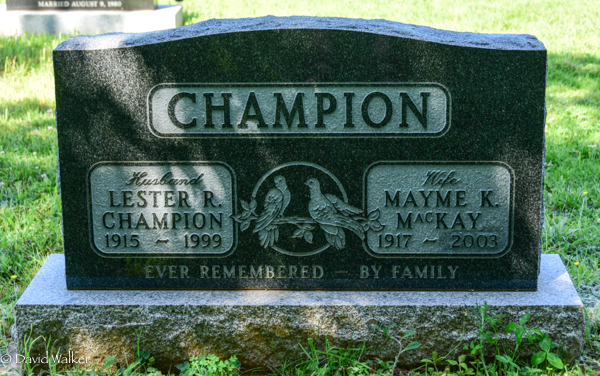 Inscription: CHAMPION / Husband / Lester R. / Champion / 1915 - 1999 | Wife / Mayme K. / MacKay / 1917 - 2003 / Ever Remembered - By Family.3  Tombstone, Lester R. Champion (1915-1999), his wife Mayme K. MacKay (1917-2003). Peoples Cemetery, Kensington, Prince County, Prince Edward Island, Canada.