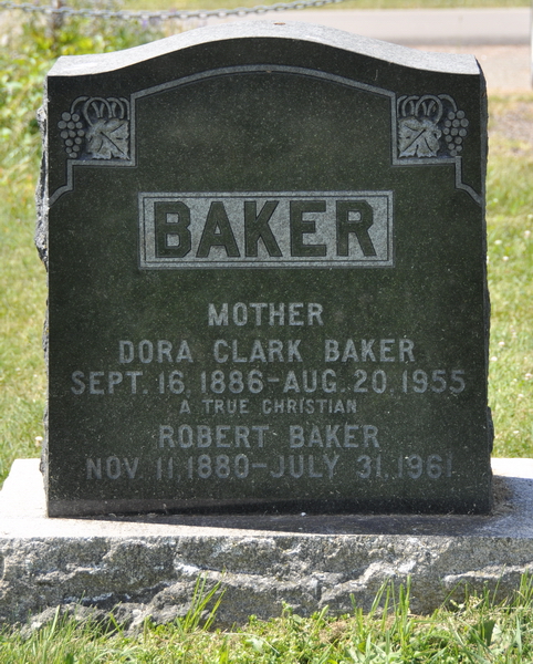 | Burial | She was buried in North Bedeque Cemetery, Prince County, Prince Edward Island, Canada, 46.36183, -63.72608G. Inscription: BAKER / Mother / Dora Clark Baker / Sept. 16, 1886 - Aug. 20, 1955 / A True Christian / Robert Baker / Nov. 11, 1880 - July 31, 1961Back: BAKER.3,4 TombstoneNorth Bedeque Cemetery, Prince County, Prince Edward Island, Canada. Robert Baker (1880-1961), his wife Dora Clark (1886-1955). |