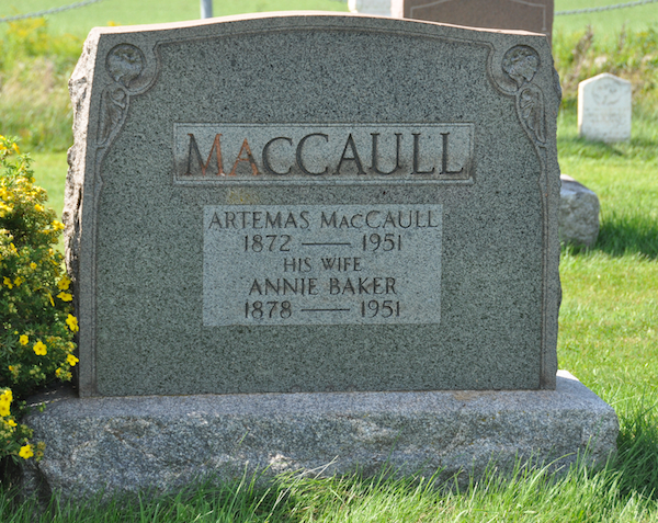 Inscription: MACCAULL / Artemas MacCaull / 1872 - 1951 / His wife / Annie Baker / 1878 - 1951 Back: MACCAULL.2  Tombstone, Artemas MacCaull (1872-1951), his wife Annie Baker (1878-1951). North Bedeque Cemetery, North Bedeque, Prince County, Prince Edward Island.