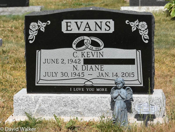 Inscription: EVANS / Married Nov. 24, 1962 / C. Kevin / June 2, 1942 / / N. Diane / July 30, 1945 - Jan. 14, 2015 / I love you moreBack: EVANS.2,3  Marker, Diane MacMurdo (1945-2015). United Church Cemetery, North Bedeque, Prince County, Prince Edward Island, Canada.