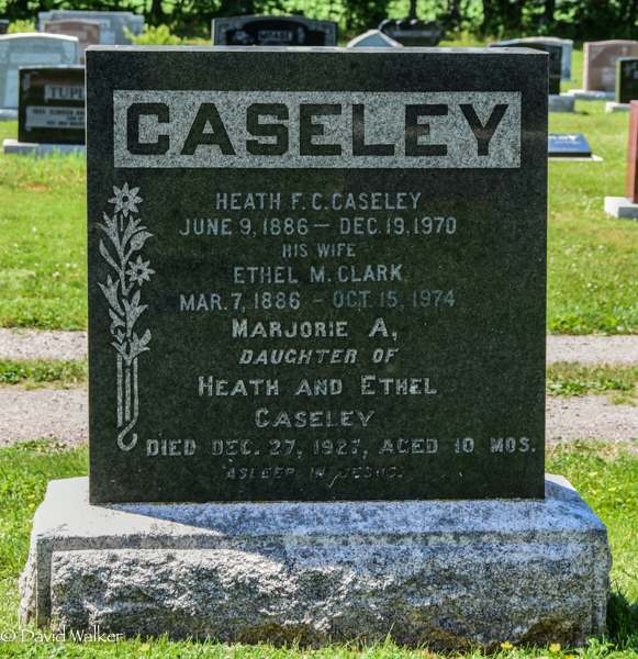 | Burial | He was buried in the Peoples Cemetery, Kensington, Prince County, Prince Edward Island, Canada, 46.44810, -63.62918G. inscription: CASELEY / Heath F.C. Caseley / June 9, 1886 - Dec. 19, 1970 / His Wife / Ethel M. Clark / Mar. 7, 1886 - Oct. 15, 1974 / Marjorie A., / Daughter of Heath and Ethel / Caseley / Died Dec. 27, 1927, Aged 10 mos. / Asleep in Jesus.2 Tombstone, Heath Caseley (1886-1970), his wife Ethel Clark (1886-1974), daughter Marjorie A. Caseley (1927-1927). The Peoples Cemetery, Kensington, Prince County, Prince Edward Island, Canada. |