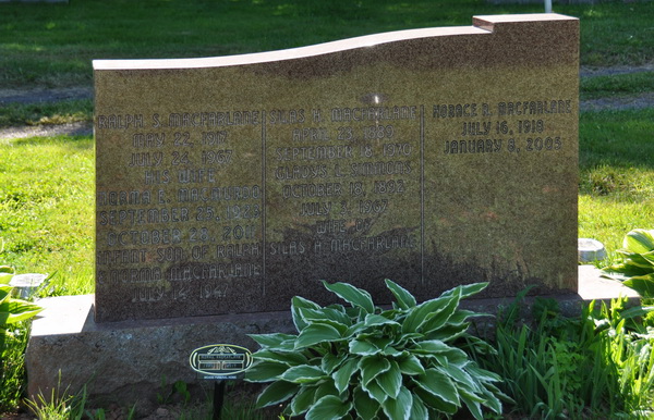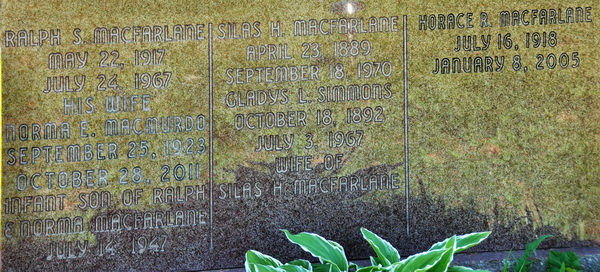 | Burial | He was buried in the Peoples Cemetery, Summerside, Prince County, Prince Edward Island, Canada, 46.40552, -63.77595G. Inscription: Ralph S. MacFarlane / May 22, 1917 / July 24, 1967 / His wife / Norma E. MacMurdo / September 25, 1923 / October 28, 2011 / Infant son of Ralph / & Norma MacFarlane / July 14, 1947 / Silas H. MacFarlane / April 23, 1889 / September 18, 1970 / Gladys L. Simmons / October 18, 1892 / July 3, 1967 / wife of / Silas H. MacFarlane | Horace R. MacFarlane / July 16, 1918 / January 8, 2005. Back: MACFARLANE.1 Tombstone, Ralph Stewart MacFarlane (1917-1967), his wife Norma E. MacMurdo (1923-2011), an unamed infant son (1947-1947), his father Silas H. MacFarlane (1889-1970), mother Gladys L. Simmons (1892-1967), and Ralph's brother Horace R. MacFarlane (1918-2005). Peoples Cemetery, Summerside, Prince County, Prince Edward Island, Canada.  Front inscription detail. |
