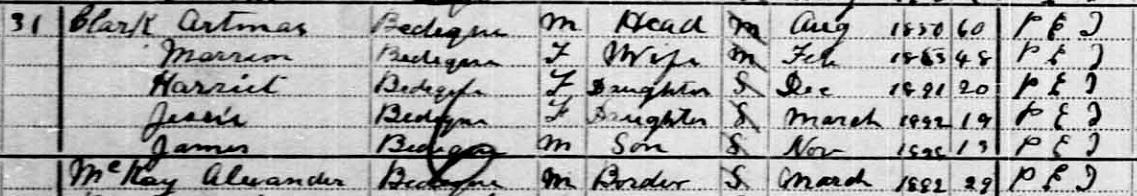 | Witness | Artemas Clark was enumerated on the census on 4 April 1881 in the household of Harriet Hooper in Lot 25, Prince County, Prince Edward Island, CanadaG. listed in the household with Harriet were her sons Artemas and John R., and daughter Jessie M.4![]() 1881 Canada Census, Harriet (Hooper) Clark, head of household. Listed with her were her sons Artemas & John R., and daughter Jessie M. Rodrick McKay, a boarder, teacher, was also listed. |