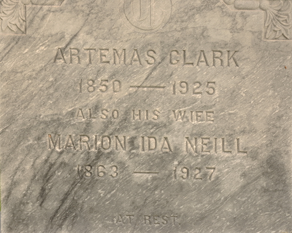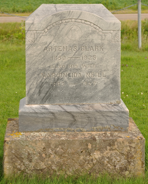 | Burial | She was buried in North Bedeque Cemetery, North Bedeque, Prince County, Prince Edward Island, Canada, 46.36174, -63.72617G. Inscription: Artemas Clark / 1850 - 1925 / Also His Wife / Marion Ida Neill / 1863 - 1927 / At Rest Left side: His / Brother / John R. / 1862 - 1932.6 ![]() Tombstone for Artemas Clark, his wife, Marion Ida Neill, and his brother John R. Clark. North Bedeque Cemetery, Prince County, Prince Edward Island. ![]() Left inscription detail. ![]() Front inscription detail. |