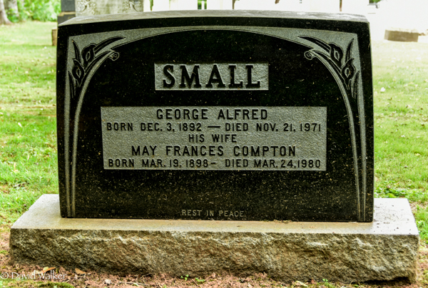 | Burial | He was buried in St. John's Anglican Cemetery, St. Eleanors, Prince County, Prince Edward Island, Canada, 46.41955, -63.80989G. Inscription: SMALL / George Alfred / Born Dec. 3, 1892 - Died Nov. 21, 1971 / His Wife / May Frances Compton / Born Mar. 19, 1898 - Died Mar. 24, 1980 / Rest in PeaceBack: SMALL.4,2 ![]() Tombstone, George Alfred Small (1892-1871), his wife May Frances Compton (1898-1980). St. John's Anglican Cemetery, St. Eleanors, Prince County, Prince Edward Island, Canada. |