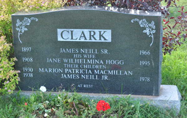 | Interred | He was buried in the plot of James Neill Clark, Sr., in North Bedeque Cemetery, North Bedeque, Prince County, Prince Edward Island, Canada, 46.36191, -63.72547G. Inscription: CLARK / 1897 James Neill Sr. 1966 / His Wife / 1908 Jane Wilhelmina Hogg 1995 / Their children / 1930 Marion Patricia MacMillan / 1938 James Neill Jr. 1978 / At Rest Back: CLARK.1 ![]() Tombstone, James Neill Clark Sr. (1898-1966), his wife Jane Wilhelmina Hogg (1908-1995), their daughter Marion Patricia MacMillan (1930- ), their son James Neill Clark Jr. (1938-1978)North Bedeque Cemetery, Prince County, Prince Edward Island. |