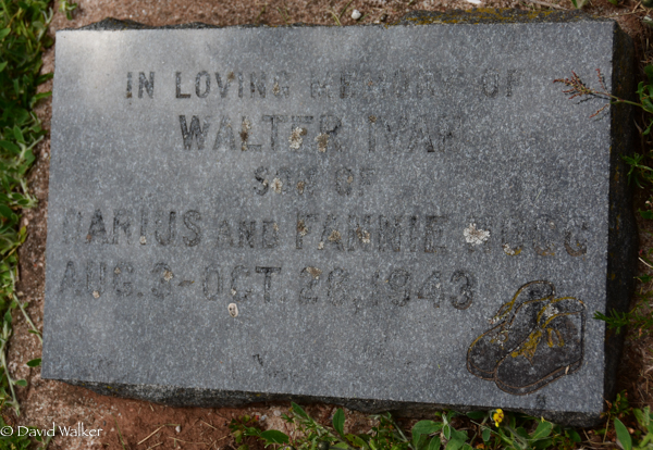 | Burial | He was buried in North Bedeque Cemetery, North Bedeque, Prince County, Prince Edward Island, Canada, 46.36201, -63.72532G. Inscription: In Loving Memory Of / Walter Ivan / son of / Darius and Fannie Hogg / Aug. 3 - Oct. 28, 1943.1 ![]() Tombstone, Walter Ivan Hogg (1943-1943). Presbyterian/United Cemetery, North Bedeque, Prince County, Prince Edward Island, Canada. |