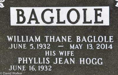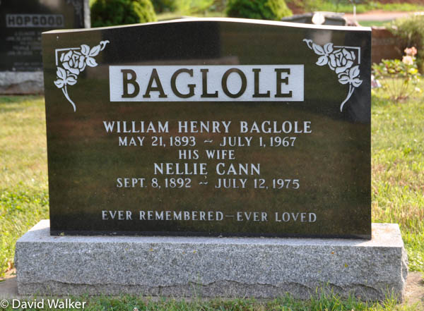 | Burial | He was buried in the Peoples Cemetery, Summerside, Prince County, Prince Edward Island, Canada, 46.40582, -63.77548G. Inscription: BAGLOLE / William Henry Baglole / May 21, 1893 - July 1, 1967 / His Wife / Nellie Cann / Sept. 8, 1892 - July 12, 1975 / Ever Remembered Ever LovedBack: BAGLOLE / William Thane Baglole / June 5, 1932 - May 13, 2014 / His Wife / Phyllis Jean Hogg / June 16, 1932 -.1,2 ![]() Tombstone, William Henry Baglole (1893-1967), his wife Nellie Cann (1892-1975), their son William Thane Baglole (1932-2014), his wife Phyllis Jean Hogg (1932- ). Peoples Cemetery, Summerside, Prince County, Prince Edward Island, Canada. ![]() Back inscription. |