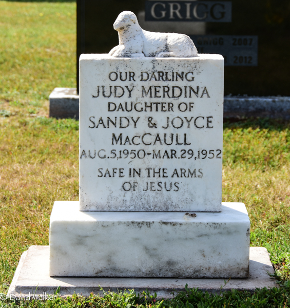 Inscription: Our Darling / Judy Merdina / Daughter of / Sandy & Joyce / MacCaull / Aug. 5, 1950 - Mar. 29, 1952 / Safe in the Arms / of Jesus.1  Tombstone, Judy Merdina MacCaull (1950-1952). United Church Cemetery, Bideford, Prince County, Prince Edward Island, Canada.