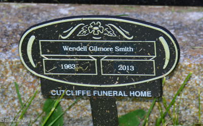 Inscription: SMITH / Gilmore Ernest Smith / 1914 - 1963 / His Wife / Audrey Leone Reeves / 1924 - 2006 / Their son / Dennis Shane Smith / 1959 - 1968Funeral home stake in front: Wendell Gilmore Smith / 1963 - 2013.2,1  Cemetery marker, Gilmore Ernest Smith (1914-1963), his wife Audrey Leone Reeves (1924-2006), their sons Dennis Shane Smith (1959-1968), Wendell Gilmore Smith (1963-2013). Bedeque Cemetery, Lower Bedeque, Prince County, Prince Edward Island, Canada.  Funeral home stake for son Wendell Gilmore Smith, in front of parent marker.