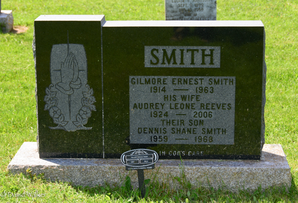 Inscription: SMITH / Gilmore Ernest Smith / 1914 - 1963 / His Wife / Audrey Leone Reeves / 1924 - 2006 / Their son / Dennis Shane Smith / 1959 - 1968Funeral home stake in front: Wendell Gilmore Smith / 1963 - 2013.1,2  Cemetery marker, Gilmore Ernest Smith (1914-1963), his wife Audrey Leone Reeves (1924-2006), their sons Dennis Shane Smith (1959-1968), Wendell Gilmore Smith (1963-2013). Bedeque Cemetery, Lower Bedeque, Prince County, Prince Edward Island, Canada.  Funeral home stake for son Wendell Gilmore Smith, in front of parent marker.