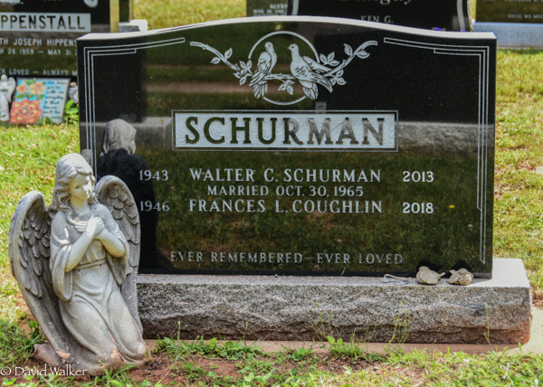 | Burial | He was buried on 29 August 2013 in the Peoples Cemetery, Summerside, Prince County, Prince Edward Island, Canada, 46.40470, -63.77485G. Inscription: SCHURMAN / Husband / 1943 Walter C. Schurman 2013 / Married Oct. 30, 1965 / Wife / 1946 Frances L. Coughlin 2018 //Ever Remembered Ever Loved.2,3,4 Tombstone, Walter Clark Schurman (1943-2013), his wife Frances L. Coughlin (1946-2018). Peoples Cemetery, Summerside, Prince County, Prince Edward Island, Canada. |