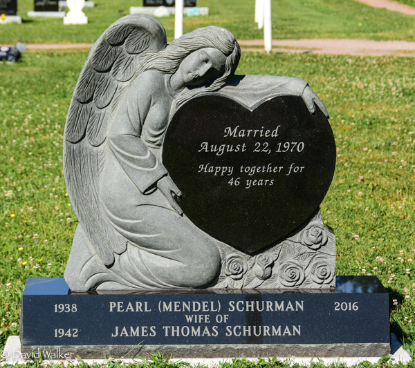 Inscription: Married / August 22, 1970 / Happy together for / 46 years // 1938 Pearl (Mendel) Schurman 2016 / 1942 James Thomas Schurman ------.2,1  Tombstone, Pearl Mendel (1938-2016). Peoples Cemetery, Kensington, Prince County, Prince Edward Island, Canada.