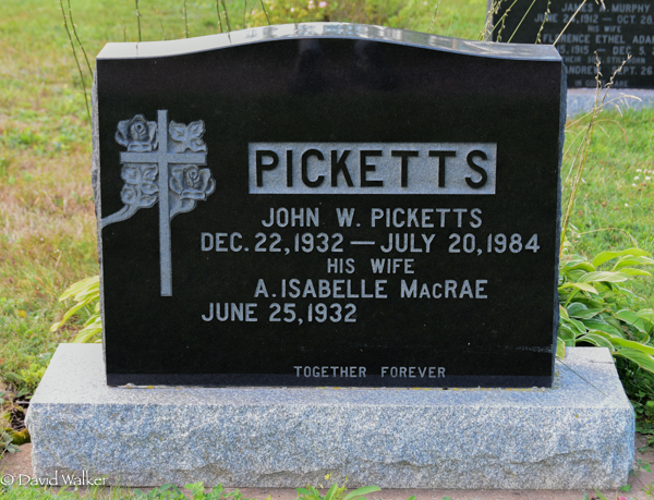 Inscription: PICKETTS / John W. Picketts / Dec. 22, 1932 - July 20, 1984 / His Wife / A. Isabelle MacRae / June 25, 1932 / Together Forever.2,1  Cemetery Marker: John W. Picketts (1932-1984), his wife A. Isabelle MacRae (1932- ). Peoples Cemetery, Kensington, Prince County, Prince Edward Island, Canada.