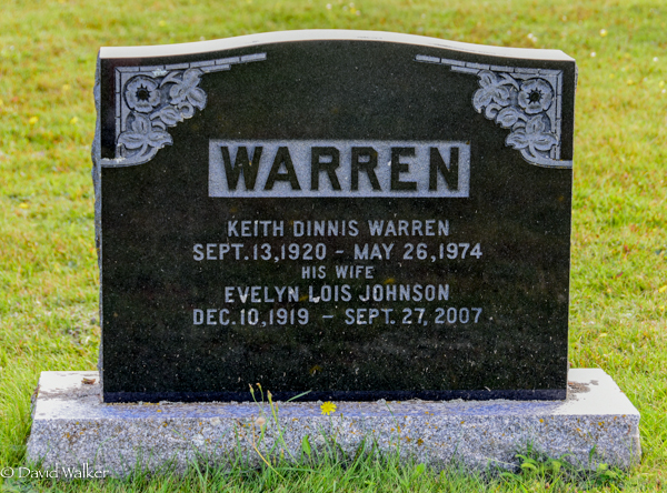 Inscription: WARREN / Keith Dinnis Warren / Sept. 13, 1920 - May 26, 1974 / His Wife / Evelyn Lois Johnson / Dec. 10, 1919 - Sept. 27, 2007.1,3  Cemetery Marker: Keith Dinnis Warren (1920-1974), his wife Evelyn Lois Johnson (1919-2007). United Church Cemetery, Margate, Prince County, Prince Edward Island, Canada.