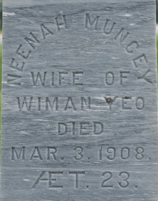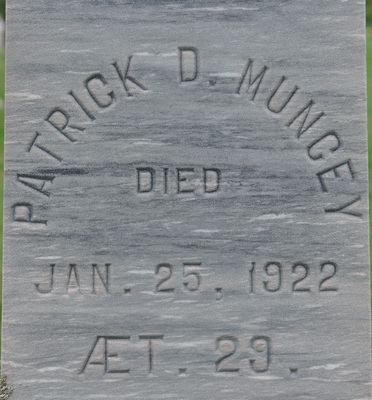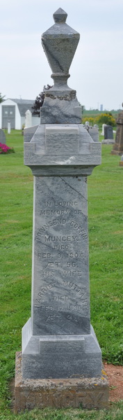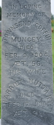 | Burial | He was buried in the United Church Cemetery, Cape Traverse, Prince County, Prince Edward Island, Canada, 46.24215, -63.65669G. Inscription: In Loving / Memory of / Townsend Coffin / Muncey / Died / Feb. 9, 1904. / ÆT. 56. / His Wife / Harriett Muttart / Died / Feb. 17, 1934. / ÆT. 81.Left: Patrick D. Muncey / Died / Jan. 25, 1922/ ÆT. 29.Right: Neenah Muncey / Wife of / Wiman (sic) Yeo / Died / Mar. 3, 1908, / ÆT. 23.Back: J. B. Leigh / Lowther / June 8, 1880 / Oct. 10, 1949 / And His Wife / Sue. M. Muncey / Nov. 16, 1874 / / At Rest.1 Tombstone, Townsend Coffin Muncey (1847-1904), his wife Harriett Muttart (1853-1934), their son Patrick Muncey (1892-1922), their daughter Nennah Muncey (1885-1908), their daughter Sue Muncey (1884-1874), her husband Leigh Lowther (1880-1949). United Church Cemetery, Cape Traverse, Prince County, Prince Edward Island, Canada.  Front inscription detail.  Left inscription detail.  Right inscription detail.  Back inscription detail. |