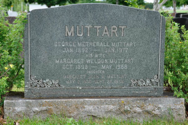 Inscription: MUTTART / George Metherall Muttart / Jan. 1892 - Jan. 1977 / His Wife / Margaret Weldon Muttart / Oct. 1898 - May, 1988 / Daughter / Margaret Joan B. Muttart / May 2, 1931 - Sept. 22, 1956.1,2  Tombstone, George Metherall Muttart (1892-1977), his wife Margaret Weldon (1898-1988), their daughter Margaret Joan Muttart (1931-1956). Peoples Cemetery, Summerside, Prince County, Prince Edward Island, Canada.