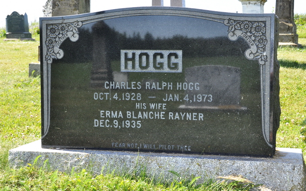 Inscription: HOGG / Charles Ralph Hogg / Oct. 4, 1928 - Jan. 4, 1973 / His Wife / Erma Blanche Rayner / Dec. 9, 1935 - 19 Feb. 2020 / Fear not, I will pilot thee.Back: HOGG.2,1  TombstoneNorth Bedeque Cemetery, Prince County, Prince Edward Island, Canada. Charles Ralph Hogg (1928-1973), his wife Erma Blanche Rayner (1935- ).