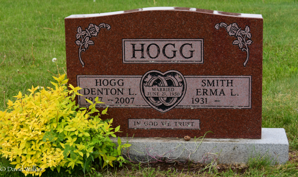 Inscription: HOGG / Hogg / Denton L. / 1927 - 2007 | Married / June 21, 1950 | Smith / Erma L. / 1931 - // In God We Trust.1,3  Cemetery marker, Denton Lea Hogg (1927-2007), his wife Erma Lois Smith (1931- ). Presbyterian/United Cemetery, North Bedeque, Prince County, Prince Edward Island, Canada.