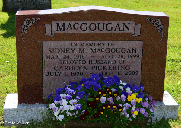 Inscription: MACGOUGAN / vIn Memory of / Sidney M. MacGougan / Mar. 24, 1916 - Aug. 28, 1999 / Beloved Husband of / Carolyn Pickering / July 1, 1920 - Oct. 6, 2009.2,3  Cemetery marker, Sidney MacGougan (1916-1999), his wife Carolyn Pickering (1920-2009). Peoples Cemetery, Malpeque, Prince County, Prince Edward Island, Canada.