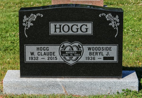 Inscription: HOGG / Hogg / W. Claude / 1932 - 2015 | Married / Sept. 15, 1954 | Woodside / Beryl J. / 1936 -.2,3  Tombstone, W. Claude Hogg (1932-2015), his wife Beryl J. Woodside (1936- ). Peoples Cemetery, Kensington, Prince County, Prince Edward Island, Canada.