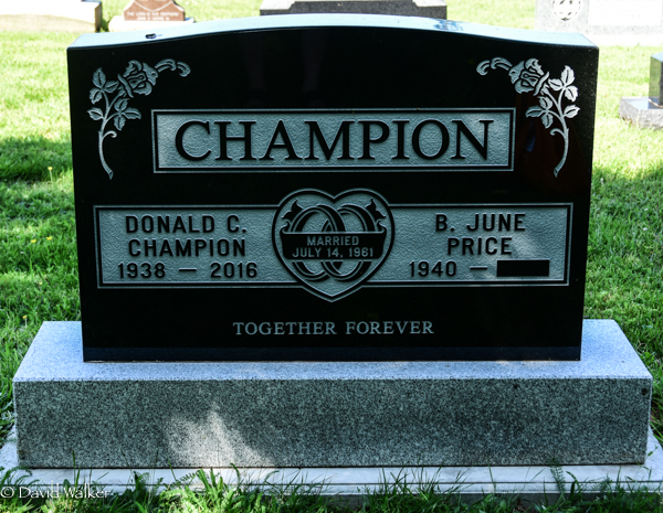 Inscription: CHAMPION / Donald C. / Champion / 1938 - 2016 | Married / July 14, 1961 | B. June / Price / 1940 - // Together Forever.1,2  Tombstone, Donald Carl Champion (1938-2016), his wife Barbara June Price (1940- ). Peoples Cemetery, Kensington, Prince County, Prince Edward Island, Canada.