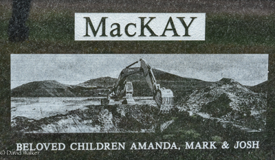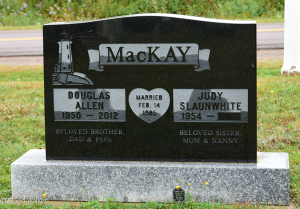 Inscription: MacKAY / Douglas / Allen / 1950 - 2012 / Beloved Brother / Dad & Papa | Married / Feb. 14 / 1985 | Judy / Slaunwhite / 1954 - / Beloved Sister / Mom & Nanny.1,2  Tombstone, Douglas Allen MacKay (1950-2012), his wife Judy Slaunwhite (1954- ). St. Thomas Anglican Cemetery, Springbrook, Queens County, Prince Edward Island, Canada.  Back inscription detail.