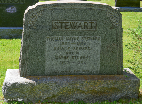 Inscription: STEWART / Thomas Mayne Stewart / 1903 - 1954 / Ruby E. Bowness / Wife of / Mayne Stewart / 1903 - 1942.2,1  Cemetery marker,Thomas Mayne Stewart (1903-1954), his wife Ruby Elizabeth Bowness (1903-1942). Peoples Cemetery, Kensington, Prince County, Prince Edward Island, Canada.