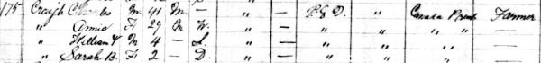 | Census | He was head of the household in the census in 1881 in Lot 27, Prince County, Prince Edward Island, CanadaG. included in the household with Charles were his mother Jane (Hooper), widowed, and sister Sarah Craig. He was listed as a farmer. Their religion was Presbyterian.4![]() 1881 Canada Census, Lot 27, Prince Edward Island, household of Charles Craig. |