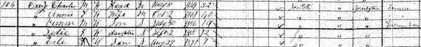 | Witness | William Vernon Craig was enumerated on the census in 1901 in the household of Charles Craig in Lot 27, Prince County, Prince Edward Island, CanadaG. included in the household were Charles' wife Annie (Montgomery), and children Vernon. (age 14), Sadie (age 12), and Erle (age 9). Charles was a farmer. The family religion was Presbyterian.7![]() 1901 Canada Census, Lot 27, Prince Edward Island, household of Charles Craig, his wife and three children. |