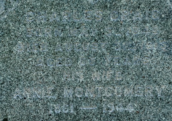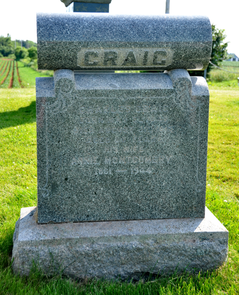 | Burial | He was buried in North Bedeque Cemetery, North Bedeque, Prince County, Prince Edward Island, Canada, 46.36161, -63.72638G. Inscription: CRAIG / Charles Craig / May 5, 1849 - 31 Aug. 1915 / Aged 66 years / His Wife / Annie Montgomery / 1861 - 1944.5![]() Tombstone, Charles Craig (1849-1915) and Nancy (Annie) Montgomery (1861-1944)North Bedeque Cemetery, Prince County, Prince Edward Island. ![]() Inscription detail (barely legible). |
