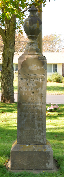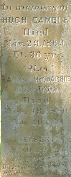 | Burial | He was buried in St. John's Anglican Church Cemetery, St. Eleanors, Prince County, Prince Edward Island, Canada, 46.41996, -63.81088G. Inscription: In Memory of / Hugh Gamble / Died / Nov. 29, 1869, / t. 36 yrs. / Also / Hannah McQuarrie / His Wife / Died / Dec. 13, 1880, / t. 40 yr. / Herbert / Died / May 26, 1868 / Blessed are the dead / which die in the Lord.1 Tombstone, Hugh Gamble (1833-1869), his wife Hannah McQuarrie (1840-1880), their son Herbert (?-1868). St. John's Anglican Church Cemetery, St. Eleanors, Prince County, Prince Edward Island, Canada.  Front inscription detail. |