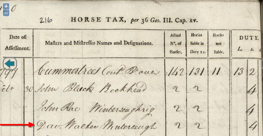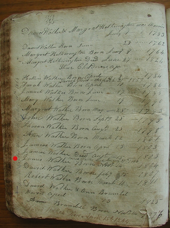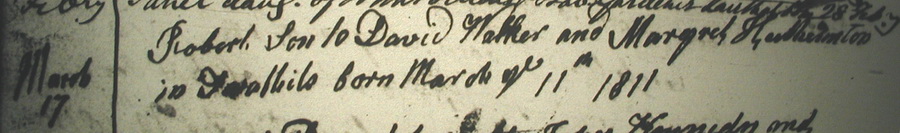 | Birth | John Walker was born on 25 September 1795 in Wintersheugh Farm, Cummertrees Parish, Dumfriesshire, Scotland, 55.016621, -3.323199G.2,3,4,1,5,6 ![]() 1795 Walker Bible, birth entry for John Walker. ![]() Second generation birth entries in the Old Parish Register, Dumfries. |