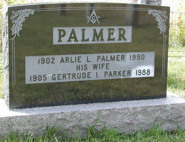 | Burial | He was buried in the Palmer Cemetery, Central Hampstead, Queens County, New Brunswick, CanadaG. Inscription: PALMER / 1902 Arlie L. Palmer 1990 / His Wife / 1905 Gertrude I. Parker 1988.5 ![]() Tombstone, Arlie Leroy Palmer (1902-1990) and his wife Gertrude Isabel Parker (1905-1988), Palmer Cemetery, Central Hampstead, Queens County, New Brunswick, Canada. |