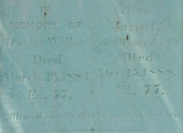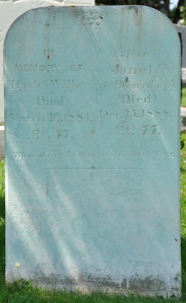 | Burial | He was buried in the Presbyterian Cemetery, North Bedeque, Prince County, Prince Edward Island, Canada, 46.36162, -63.72578G. Inscription: In Memory / of / John Walker / Died / Nov. 28, 1882. / AEt. 87. / A Native of / Dumfriesshire / Scotland / My Dearest Dear I Leave You Here / To Rest in Hope Till Christ Appear. Left: John Lea / Son of / David & Debora / Walker / Died / July 1, 1889. / AEt. 17. Right: Also his wife / Jean Wier / Died / Nov. 9, 1889. / AEt. 91.20 ![]() Tombstone of John Walker (1795-1882)North Bedeque Cemetery, Prince County, Prince Edward Island, Canada. His wife Jane Davidson Weir and grandson John Lea Walker are also buried here. ![]() Inscription detail on the obelisk tombstone of John Walker. ![]() Left side, inscription for John Lea Walker, grandson of John Walker and Jane Weir. ![]() Right side, inscription for Jane Davidson Weir (note the inscription reads Jean Wier). |
